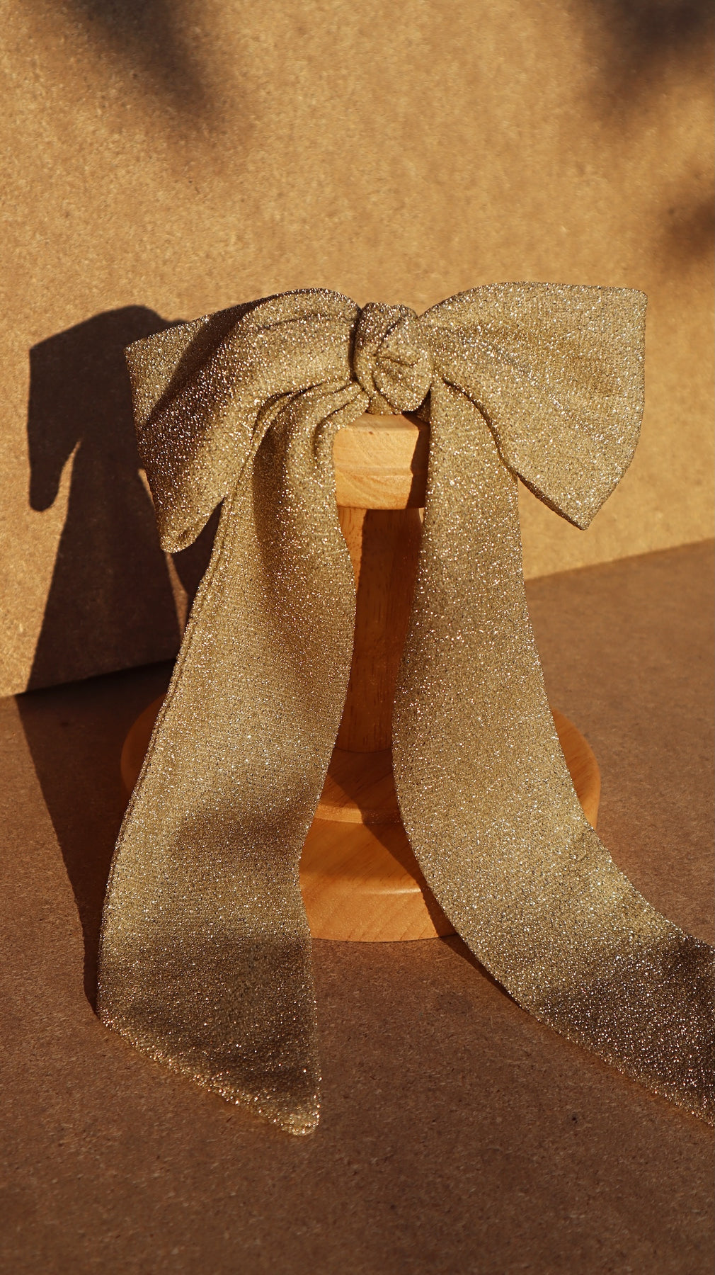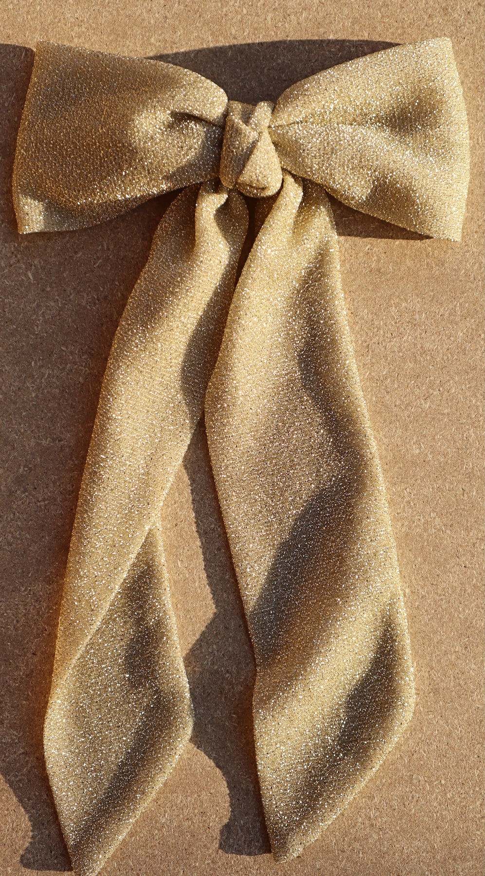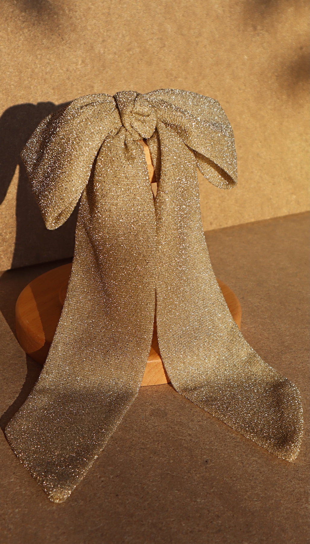In lycra dorata morbidissima, con code lunghe (40 cm). Effetto fluido e avvolgente, ideale per aggiungere luminosità e movimento ai look festivi. Chiusura con clip alla francese.
